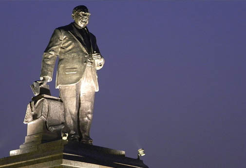 Ambedkar seated in a chair, facing towards the two domes. The Ambedkar statue