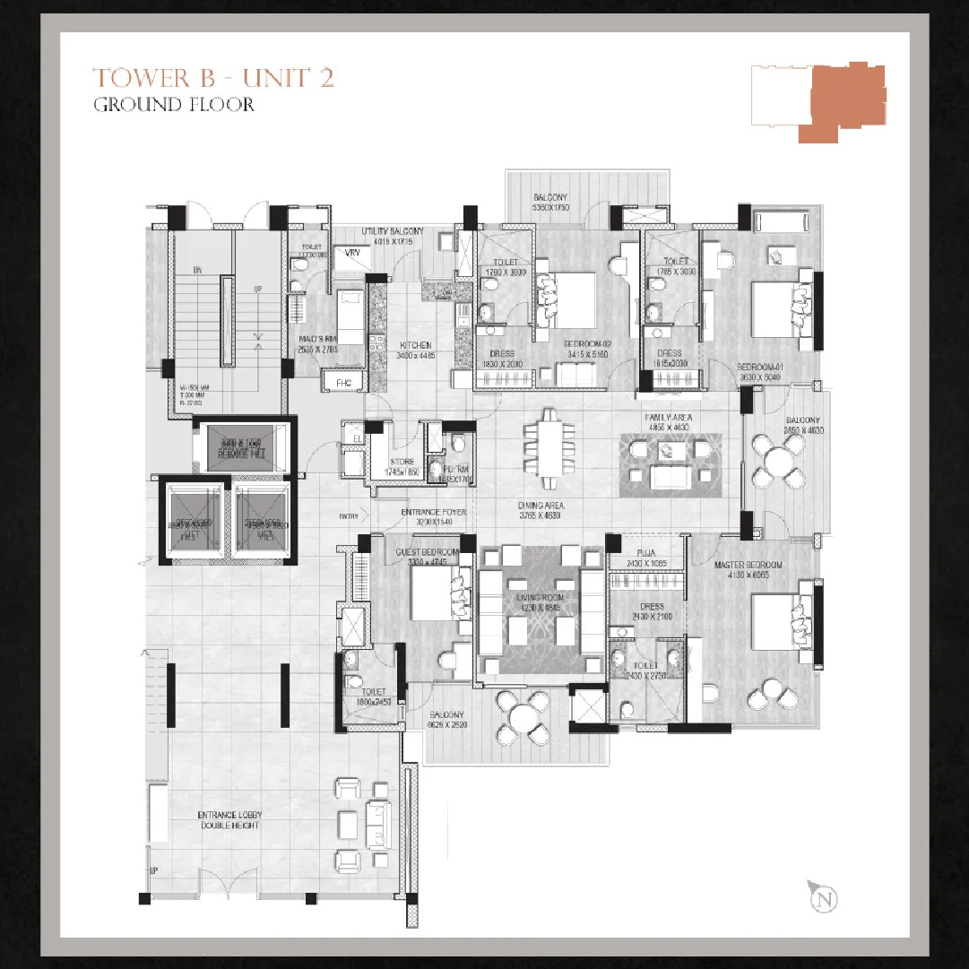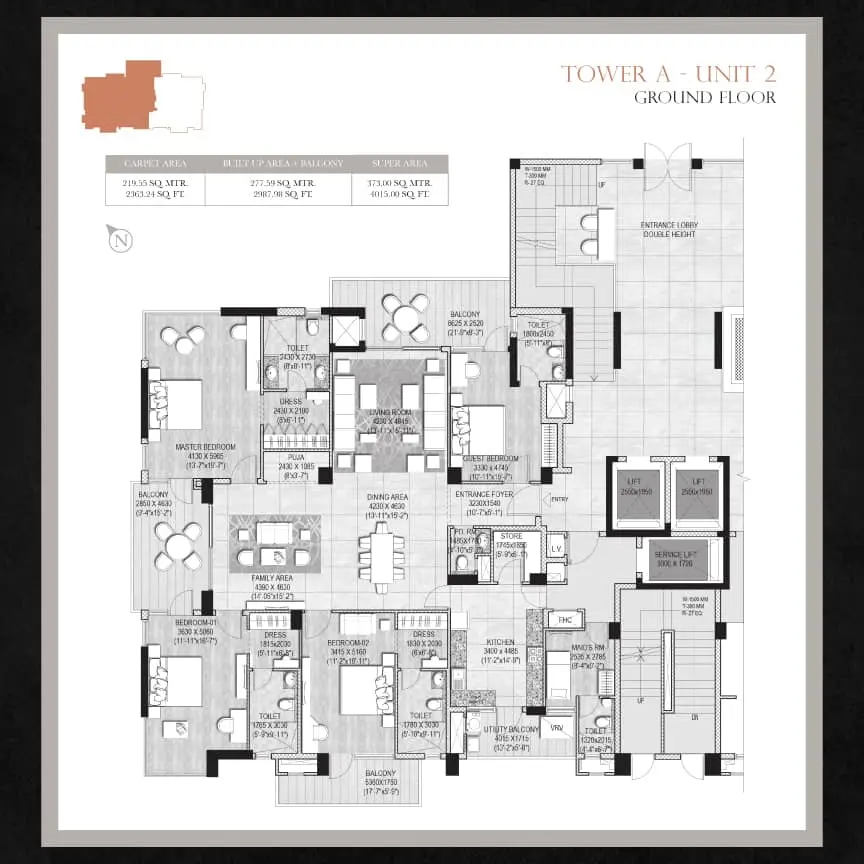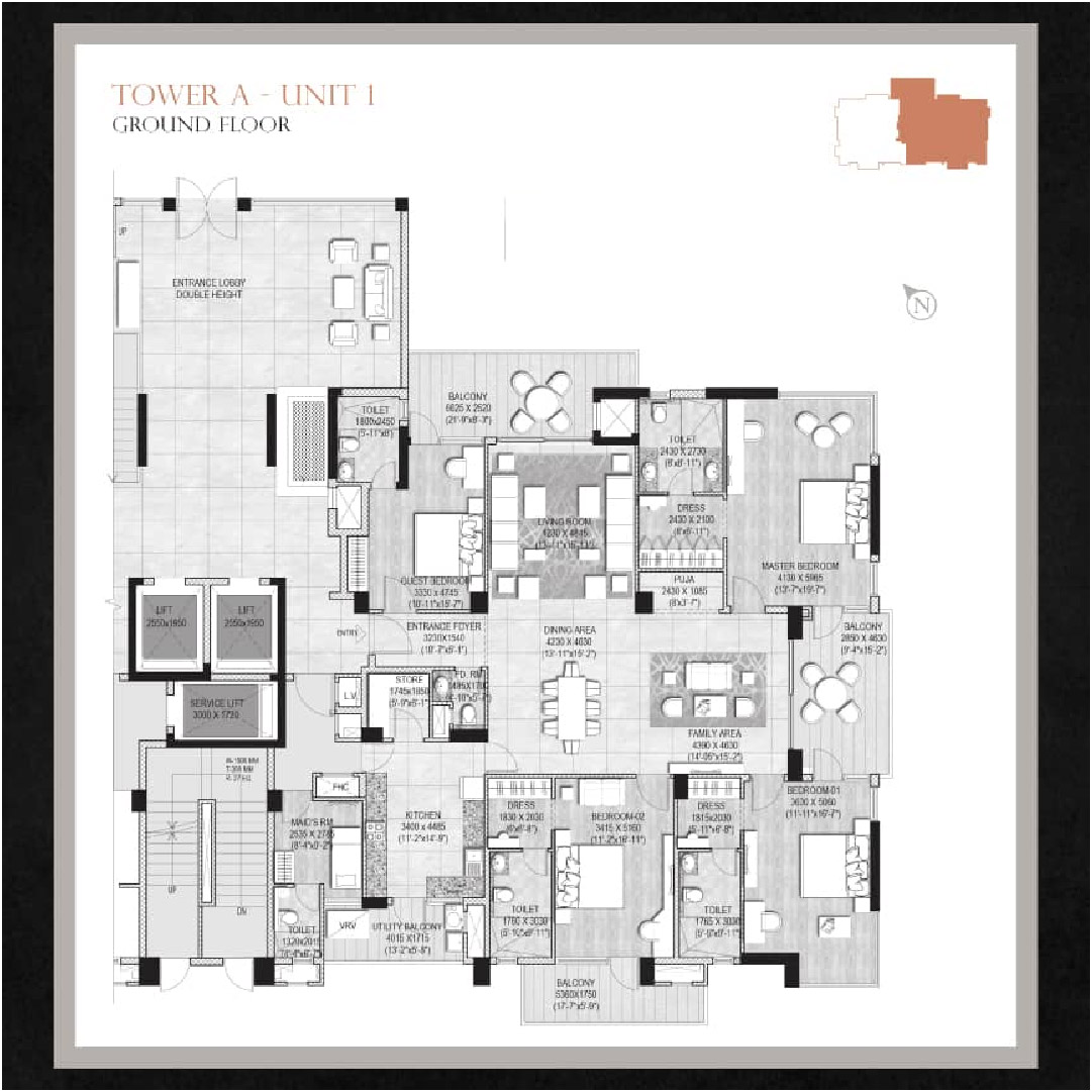 Double-height sitting lounge at the terrace with indoor game zone, All-weather pool with infinity edge, and fully equipped gymnasium with a steam facility.